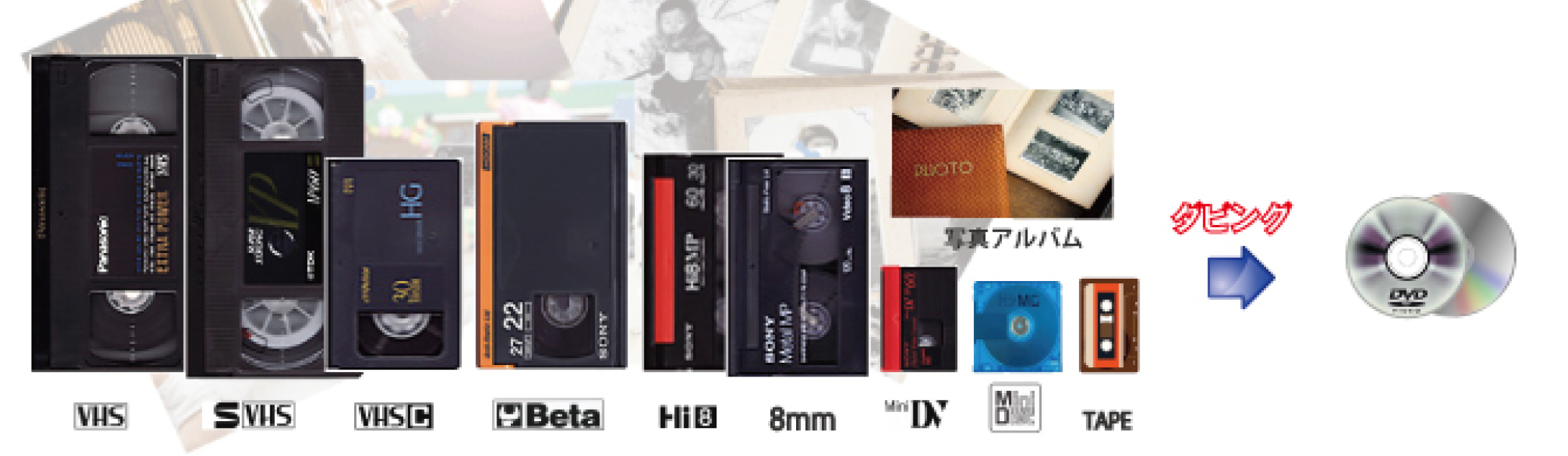 メディア機器の急速なデジタル化に伴い過去の映像(ビデオテープ VHS / SVHS / VHSC / SVHSC / 各ベータ / MiniDV / DV / Video8 / Hi8)を取り扱える機器が少なくなっています。今後これらの機器が生産されることは無く大切な思い出を見ることが叶わなくなるでしょう。またテープ自体にも経年変化によるカビの発生やテープ切れなどを引き起こし再生不可に陥るケースも見受けられます。